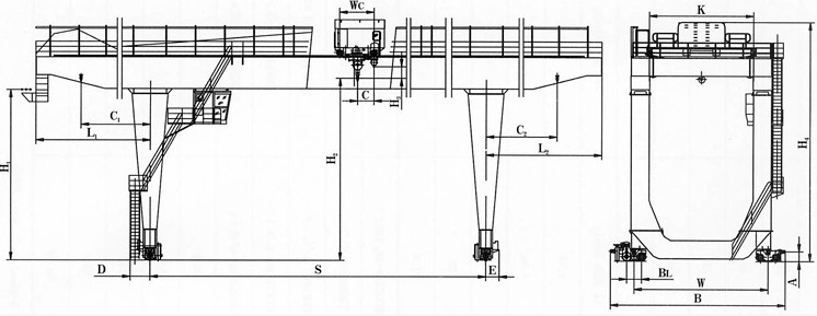 MG型門式起重機(jī)由橋梁、大車運(yùn)行機(jī)構(gòu)、小車、電氣設(shè)備組成。橋架采用箱形焊接結(jié)構(gòu),大車運(yùn)行機(jī)構(gòu)采用分別驅(qū)動(dòng)。全部機(jī)構(gòu)均在操縱室內(nèi)操縱。起重機(jī)導(dǎo)電形式分為電纜和滑觸線兩種,訂貨時(shí)任選一種。